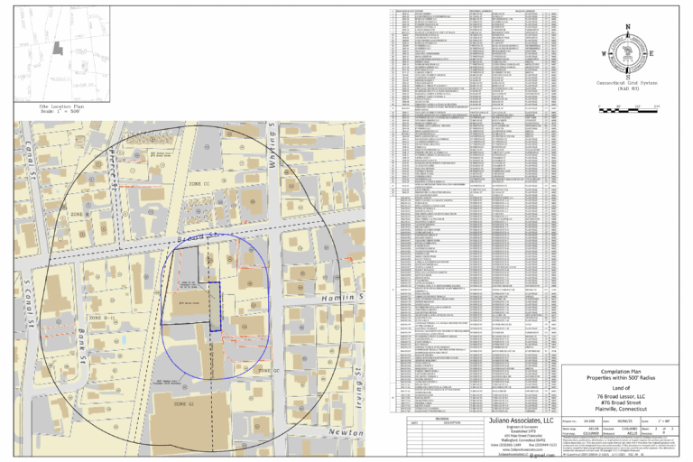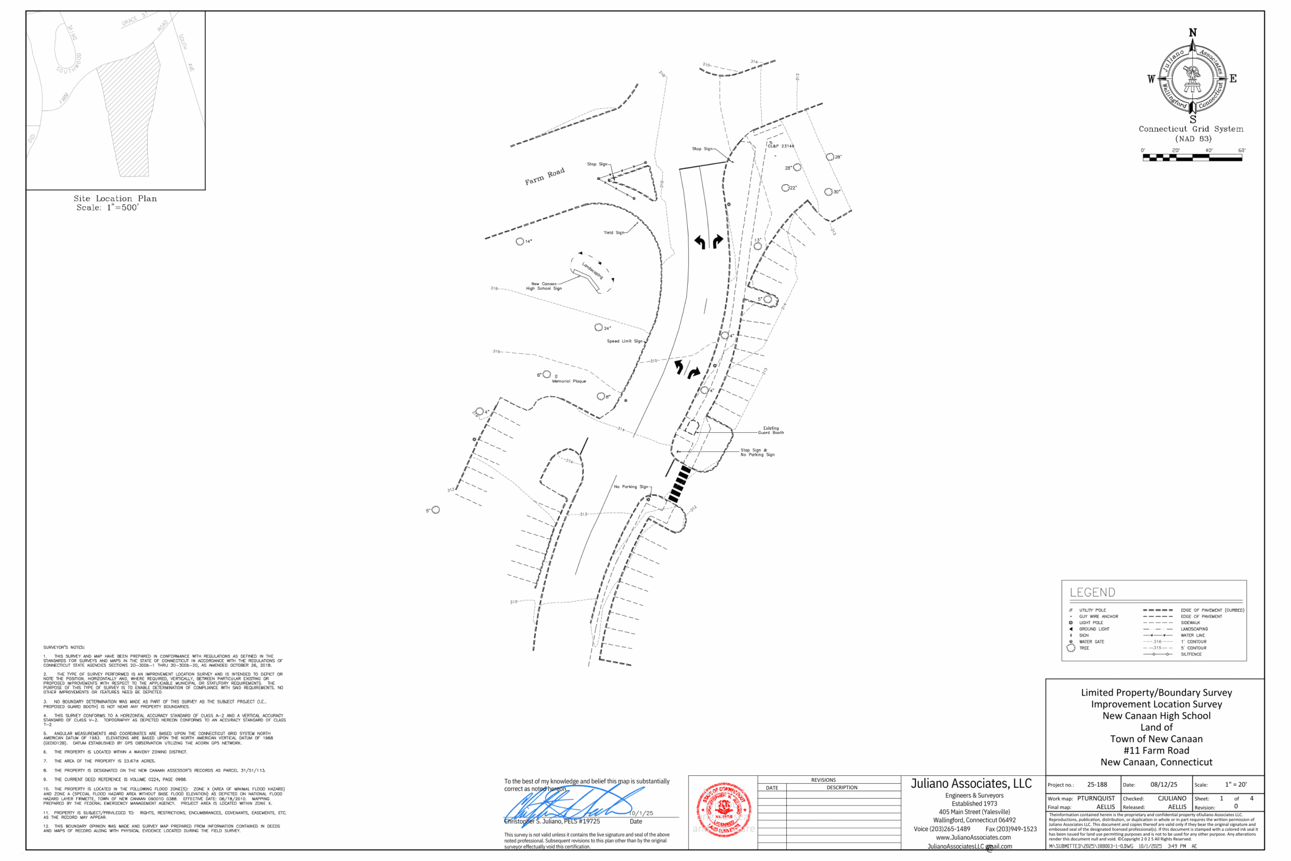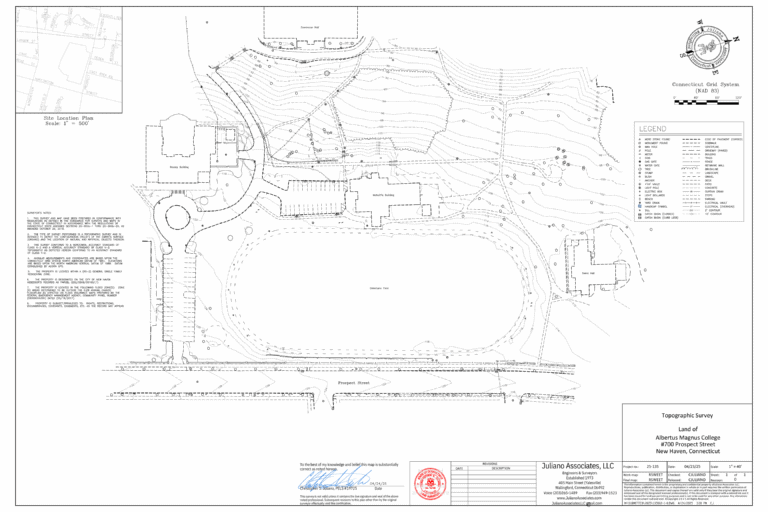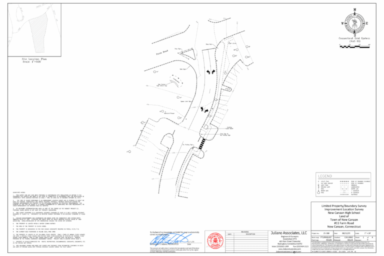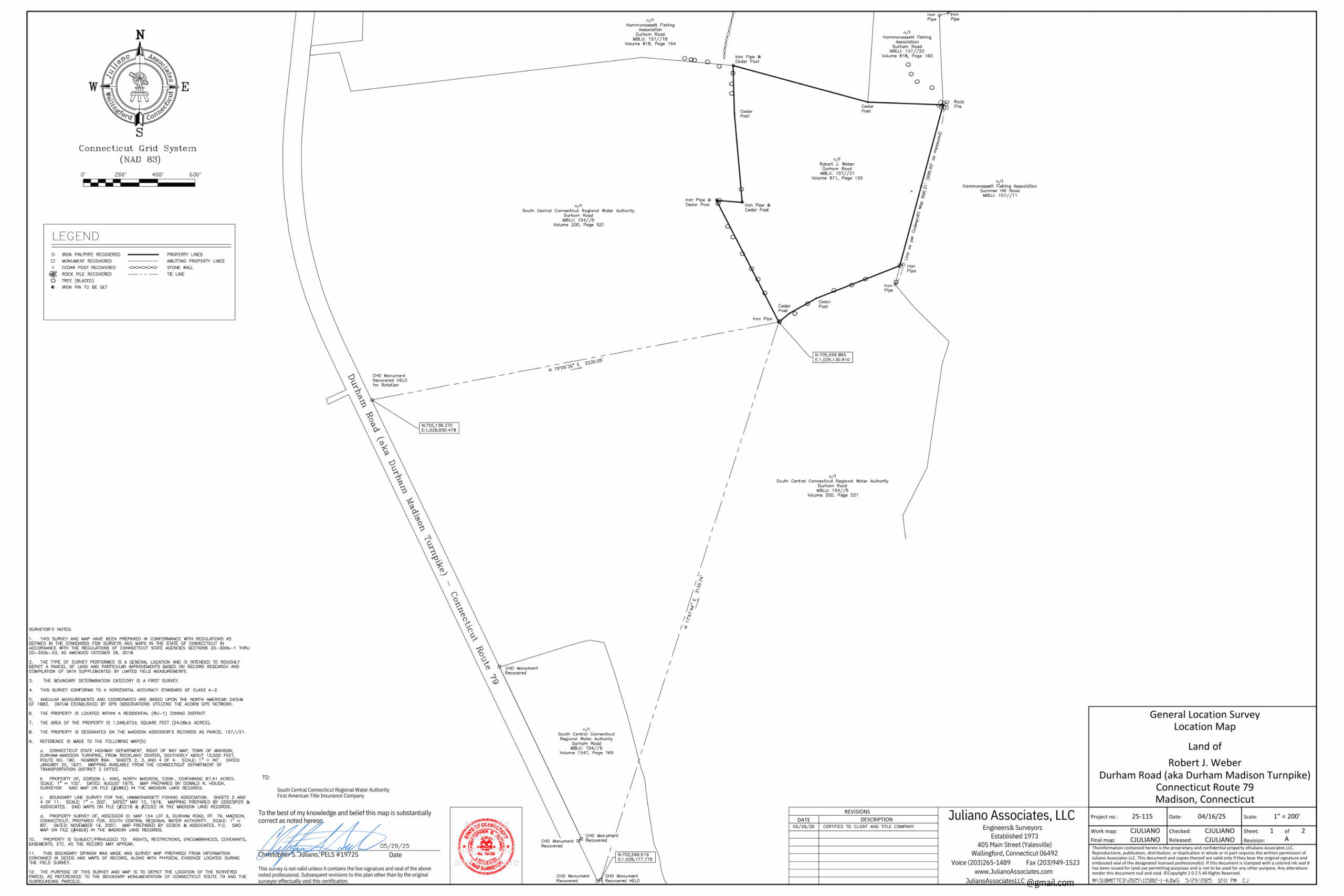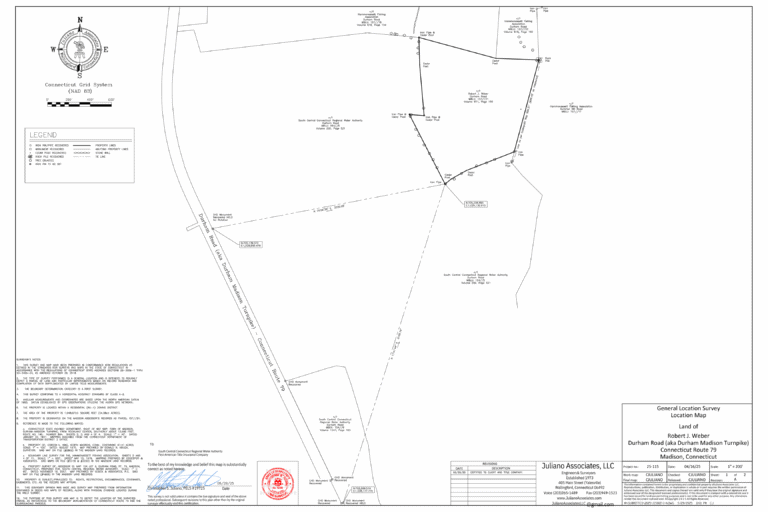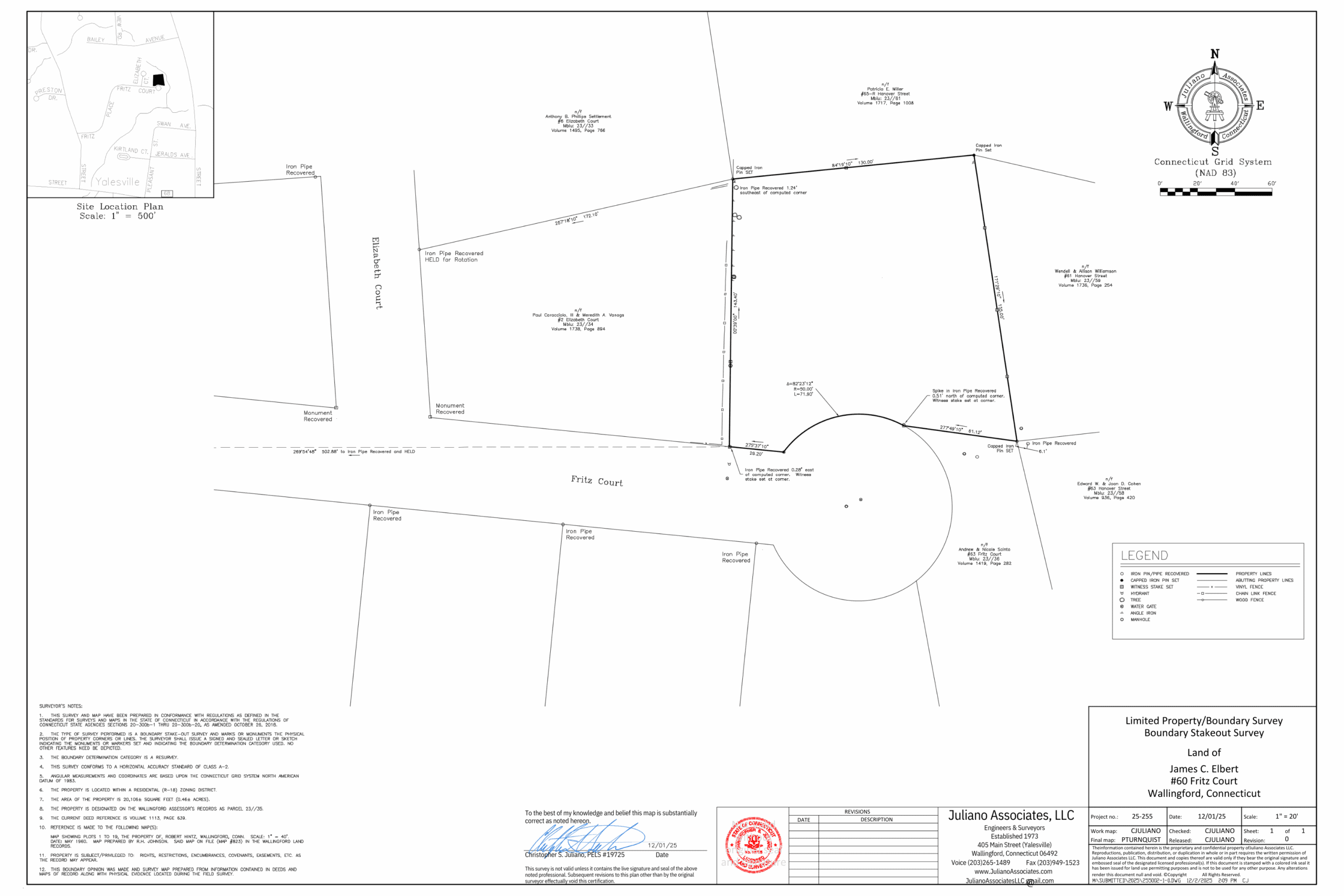 Also sometimes referred to as a boundary survey, legally defines your land’s boundaries, showing property lines, monuments, easements, rights-of-way, encroachments, and improvements (fences, driveways, buildings) according to deed research and state standards (like those from the Connecticut Association of Land Surveyors (CALS)) to resolve discrepancies and ensure compliance with local rules.