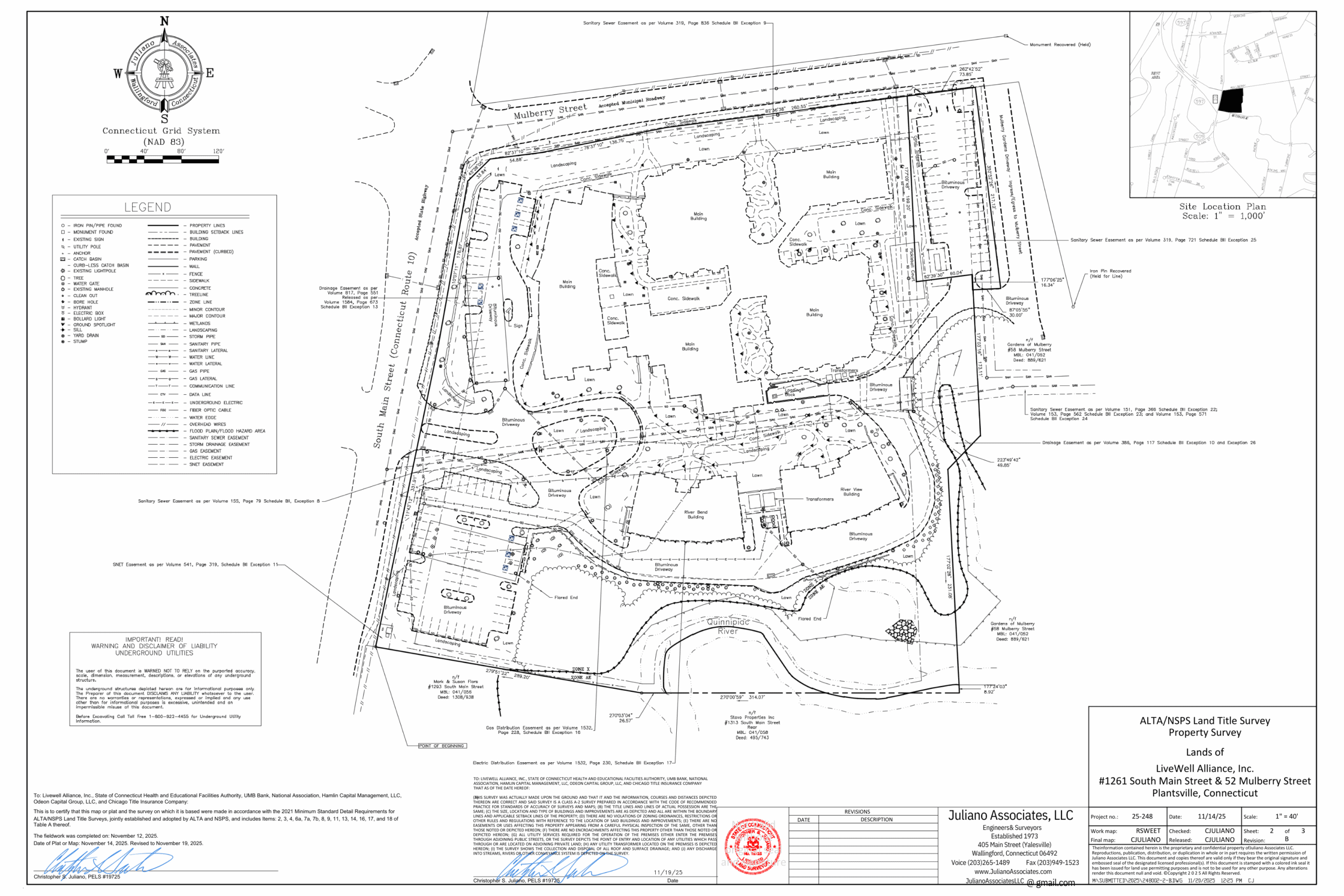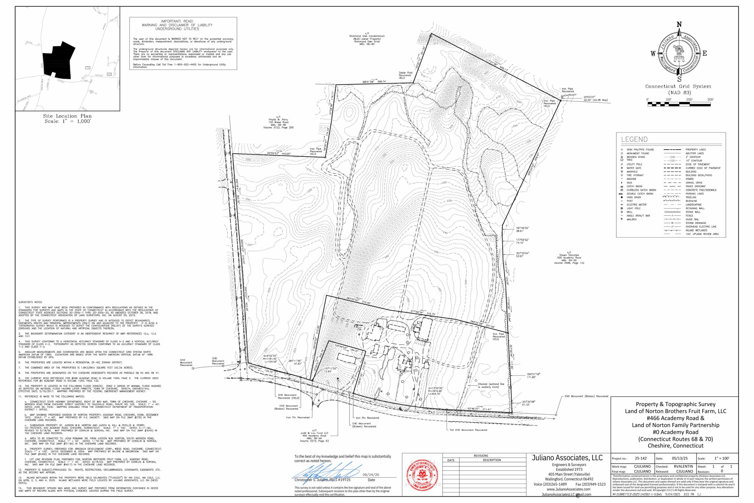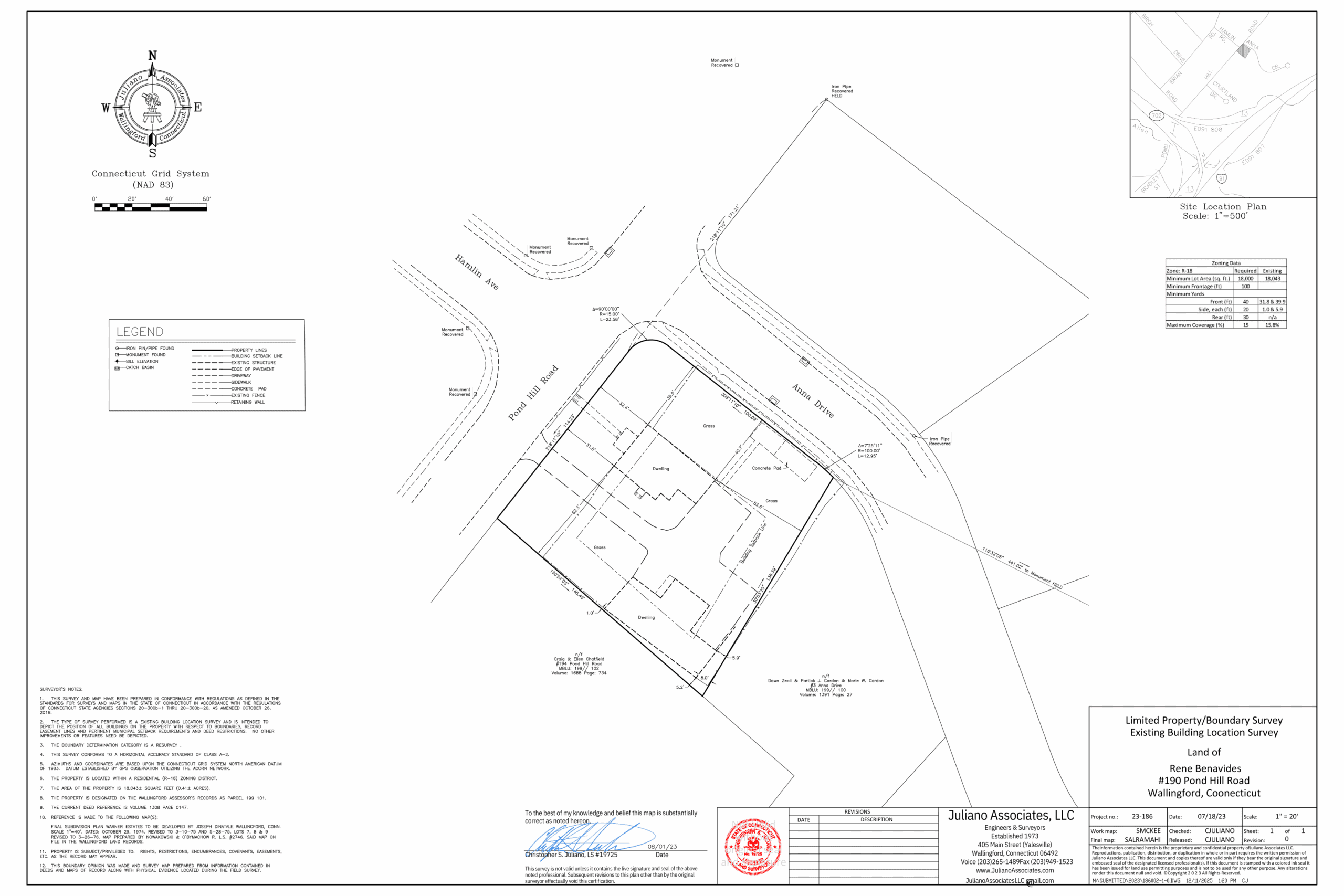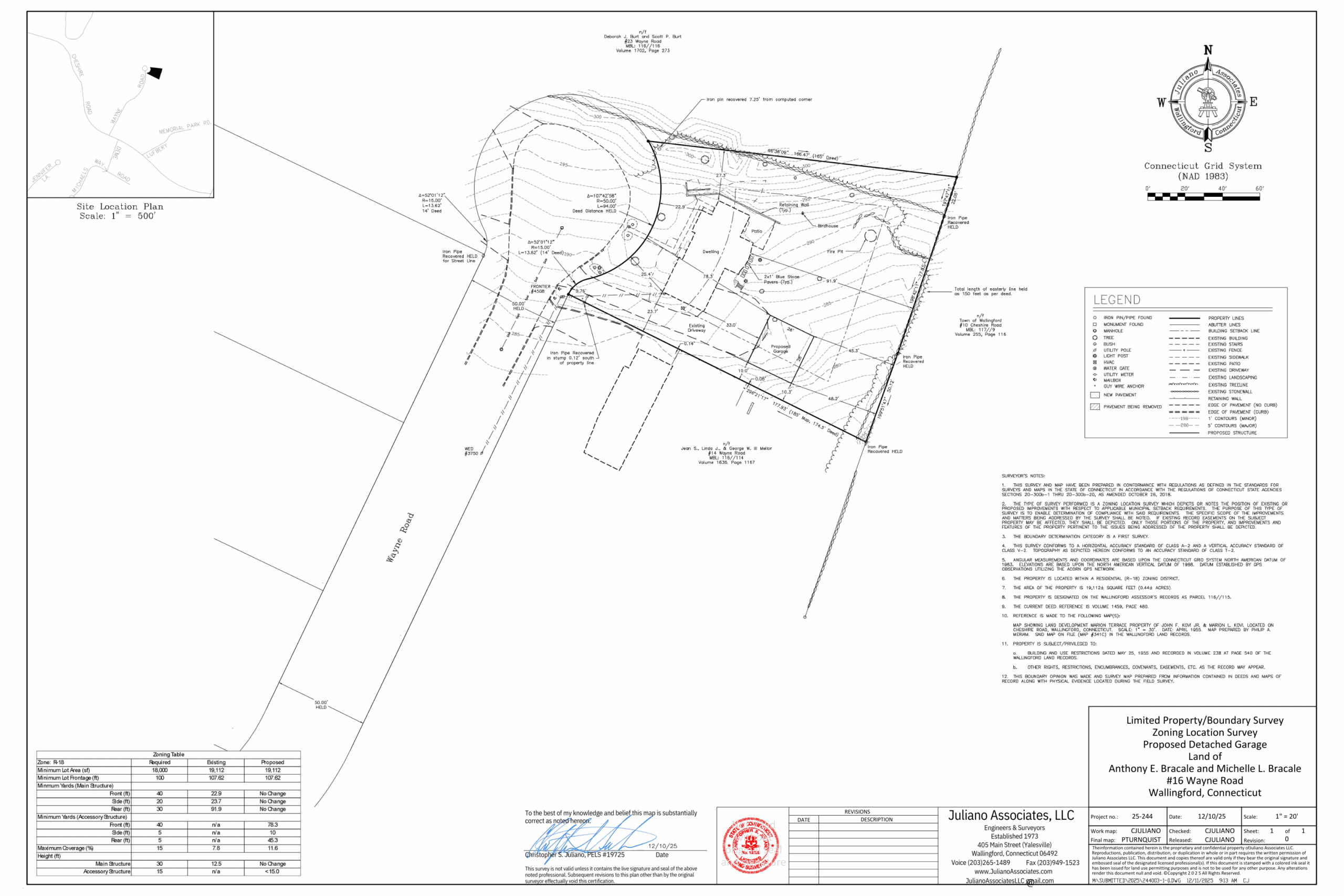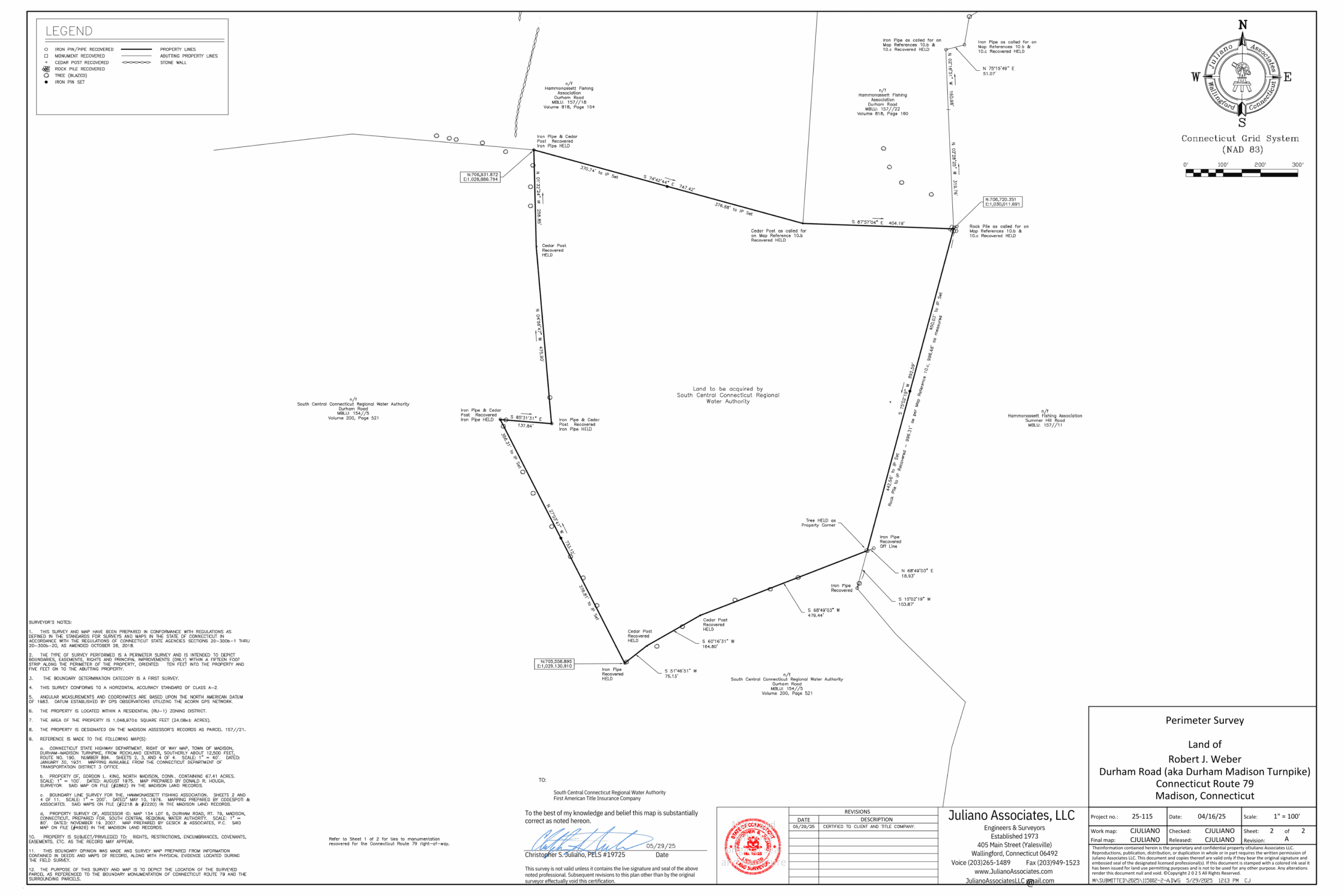 Also sometimes referred to as a boundary survey, legally defines your land’s boundaries, showing property lines, monuments, easements, rights-of-way, encroachments, and improvements (fences, driveways, buildings) according to deed research and state standards (like those from the Connecticut Association of Land Surveyors (CALS)) to resolve discrepancies and ensure compliance with local rules.