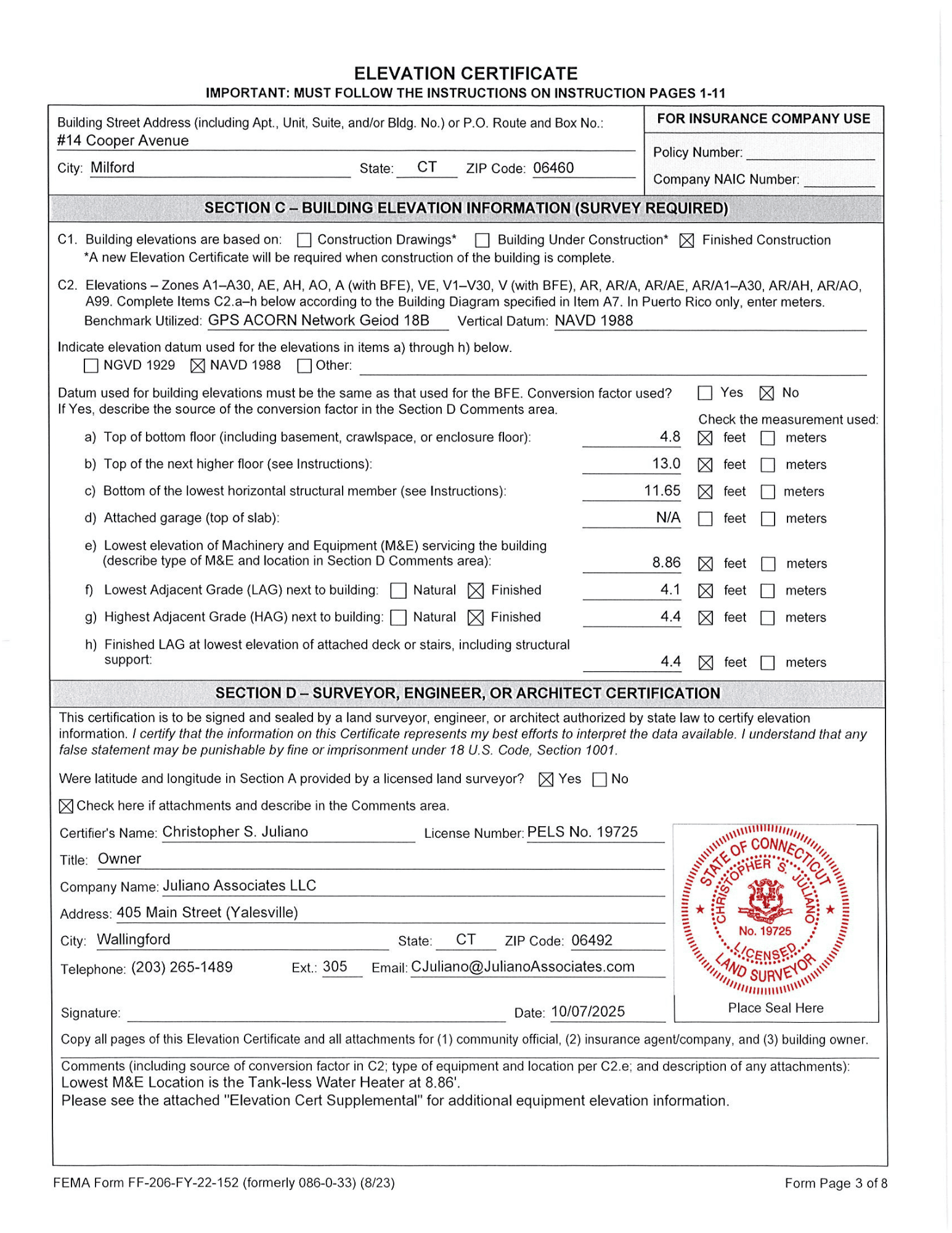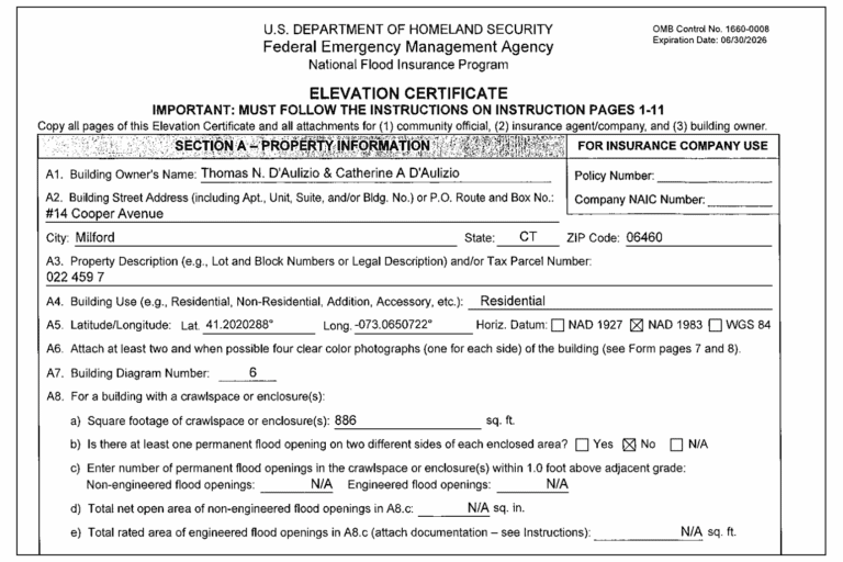 An Elevation Certificate (EC) is an official Federal Emergency Management Agency (FEMA) document that depicts a building’s elevation relative to the expected flood level, used by insurers to set flood insurance rates, enforce local building codes, and help homeowners potentially lower premiums by proving their property’s flood resistance. It details the structure’s lowest floor, machinery, and ground levels, helping determine flood risk and compliance with National Flood Insurance Program (NFIP) rules, especially for properties in high-risk flood zones.